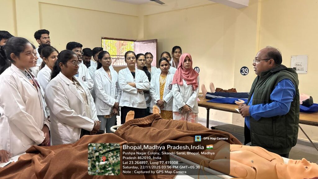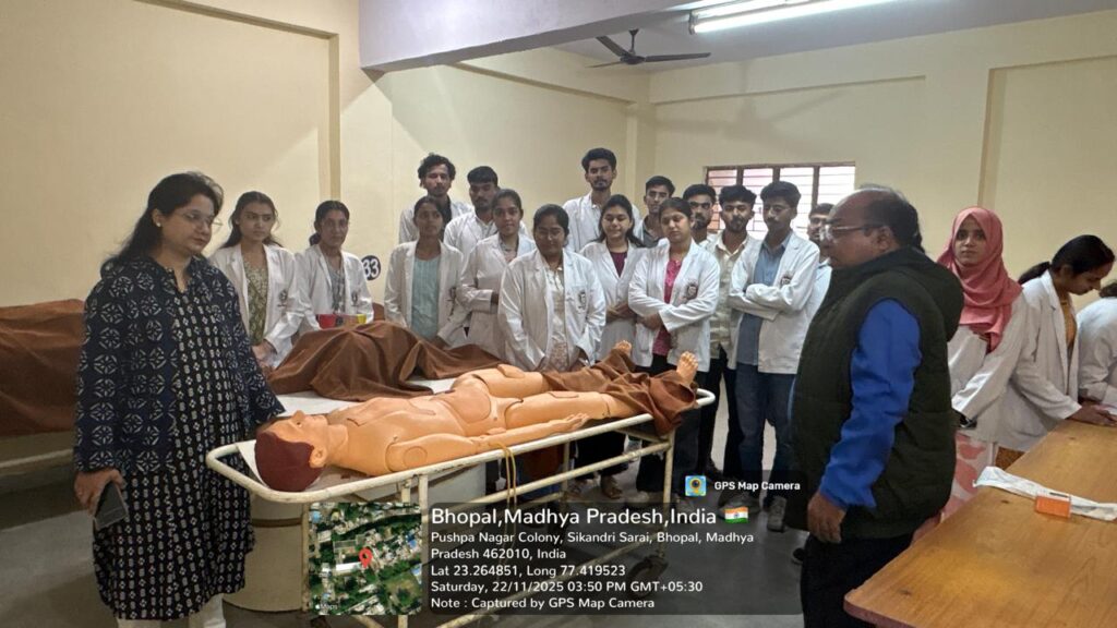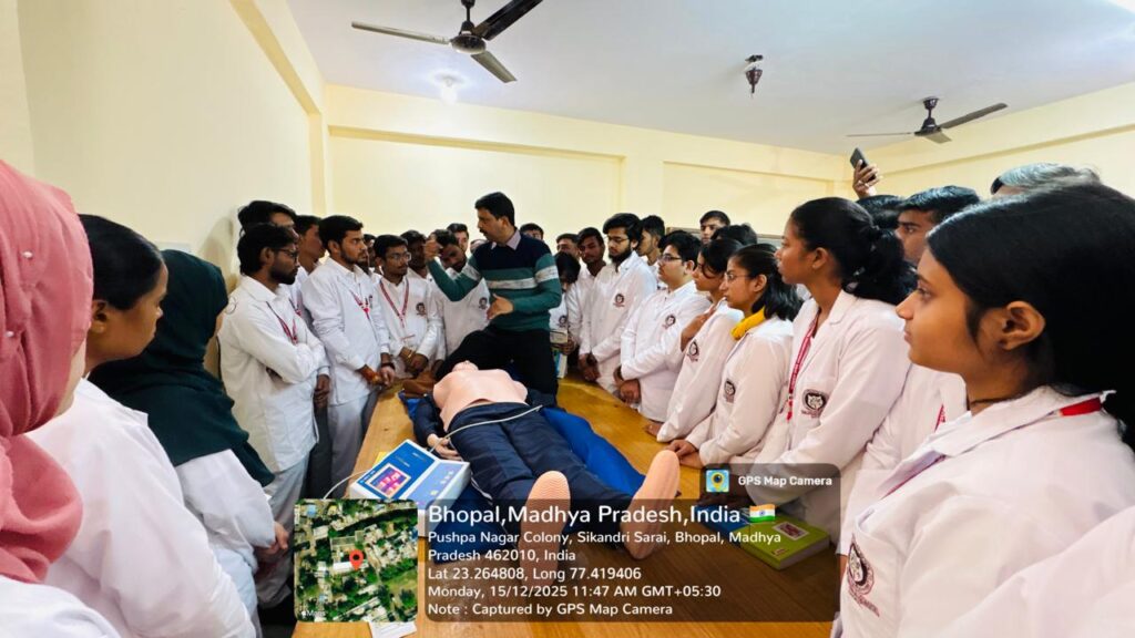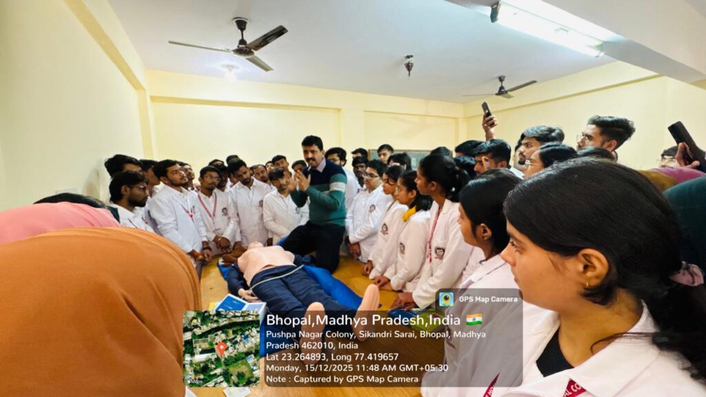 Basic life support ( CPR ) demonstration on dummy body, in Skill laboratory, conducted by Department of Practice of Medicine as a part of Foundation course of fresh batch BHMS-2025-26, with motive to impart the importance of CPR in order to rescue the unconscious person in case of emergency. The demonstration conducted by Dr. Nitesh Surywanshi – Professor & HOD, Dr. Rupesh Chandra Professor, Dr. Prachi Srivastava, Associate Professor & Dr. Chavi Chakrabarty, Assistant Professor, Dep. of PM